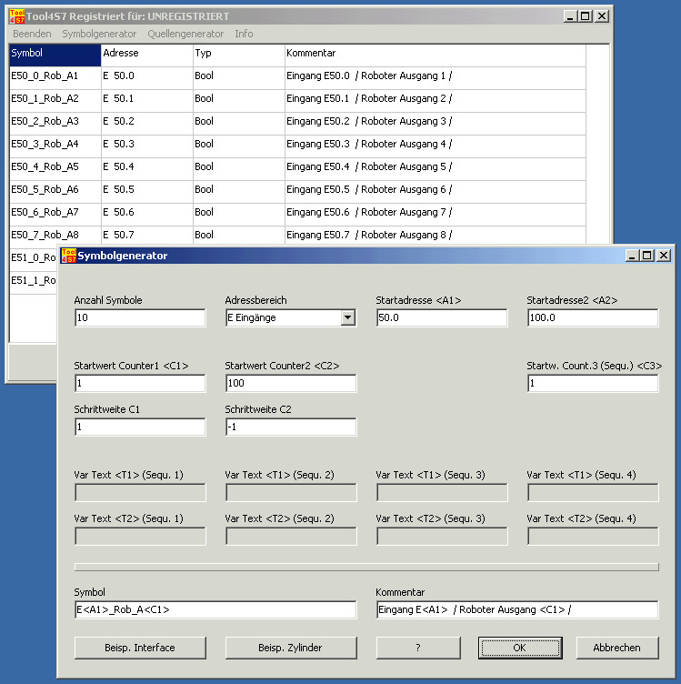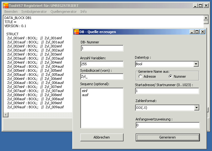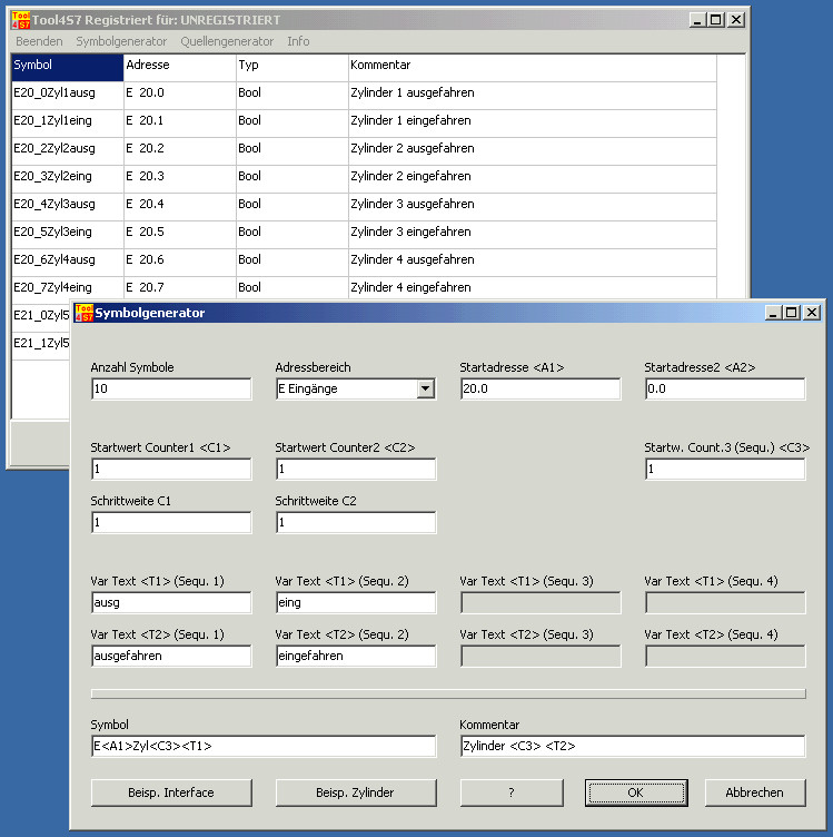 Nach Ausfüllen eines Formulares (siehe unten) werden in windeseile Symbollisten für z.B. EA's oder Schnittstellen erzeugt, welche dann per Zwischenablage im Simatic- Symboleditor eingefügt werden können.