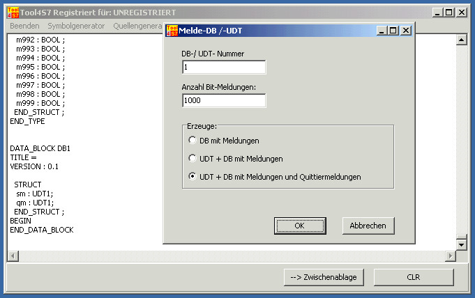 Ähnlich dem Symbolgenerator können hier AWL-Quellen für diverse UDTs und DBs erstellt werden. Per Zwischenablage kann der Quellcode in eine vorhandene AWL-Quelle eingefügt werden.